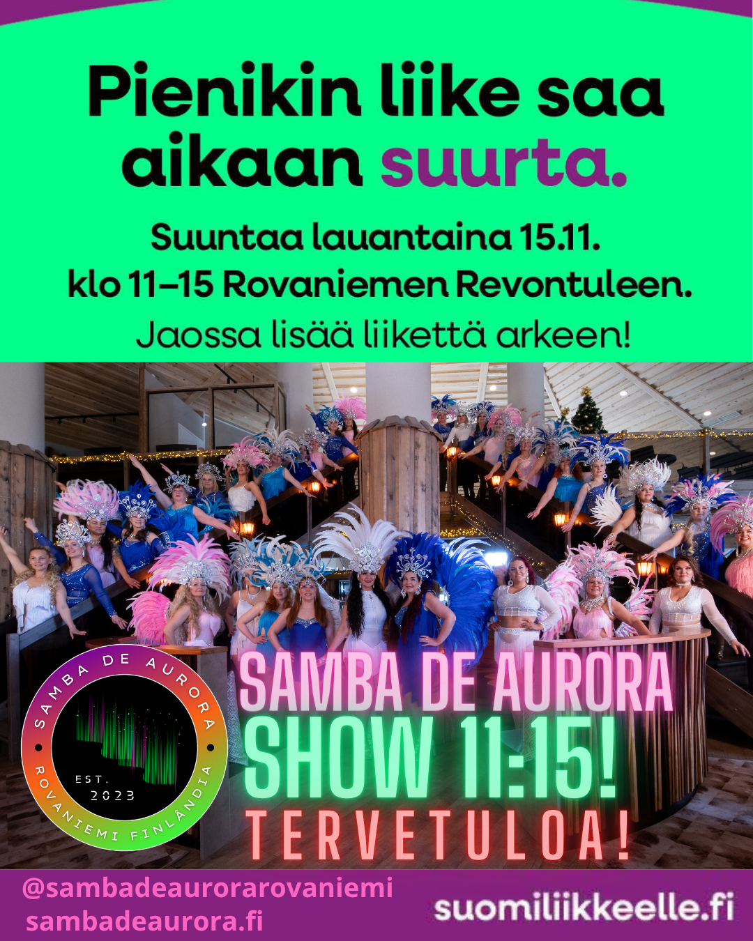 Päivä alkaa säihkyvästi, kun lavan ottaa haltuun Rovaniemen kuumin Leidiyhteisö Samba de Aurora valloittavalla samba-show'llaan noin klo 11:15 ! Tule nauttimaan rytmeistä, väriloistosta ja hyvästä fiiliksestä – ja kuule lopuksi Auroran salaisuus: miten he onnistuvat säteilemään niin paljon energiaa ja iloa yhdessä?