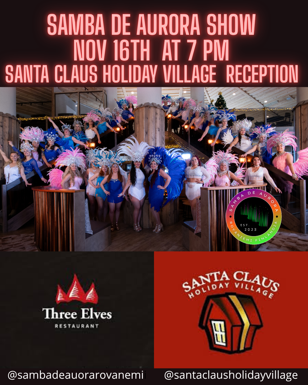 Tonight, a special part of the group is here just for you — bringing the warmth, color, glitter, and rhythm of samba to the dark Lapland night.
