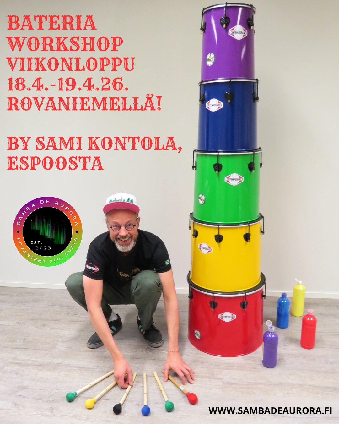 Tämä workshop sopii kaikille – niin aloittelijoille kuin kokeneille muusikoille ja tanssijoillekin. Erityisen antoisa se on tanssijoille, sillä rummuttamisen ja rytmien kautta syntyy suora, elävä yhteys siihen alkulähteeseen, josta myös tanssi kumpuaa. Viikonlopun huipennuksena luomme yhdessä unohtumattoman yhteisesityksen: Samin johdattama rumpuryhmä ja Maisun ohjaama tanssiryhmä yhdistävät voimansa näyttävässä rytmin ja liikkeen spektaakkelissa! Sydämellisesti tervetuloa mukaan! Et tarvitse muuta kuin mukavat vaatteet ja pientä evästä – Sami tuo kaikki rummut ja sambasoittimet paikalle!