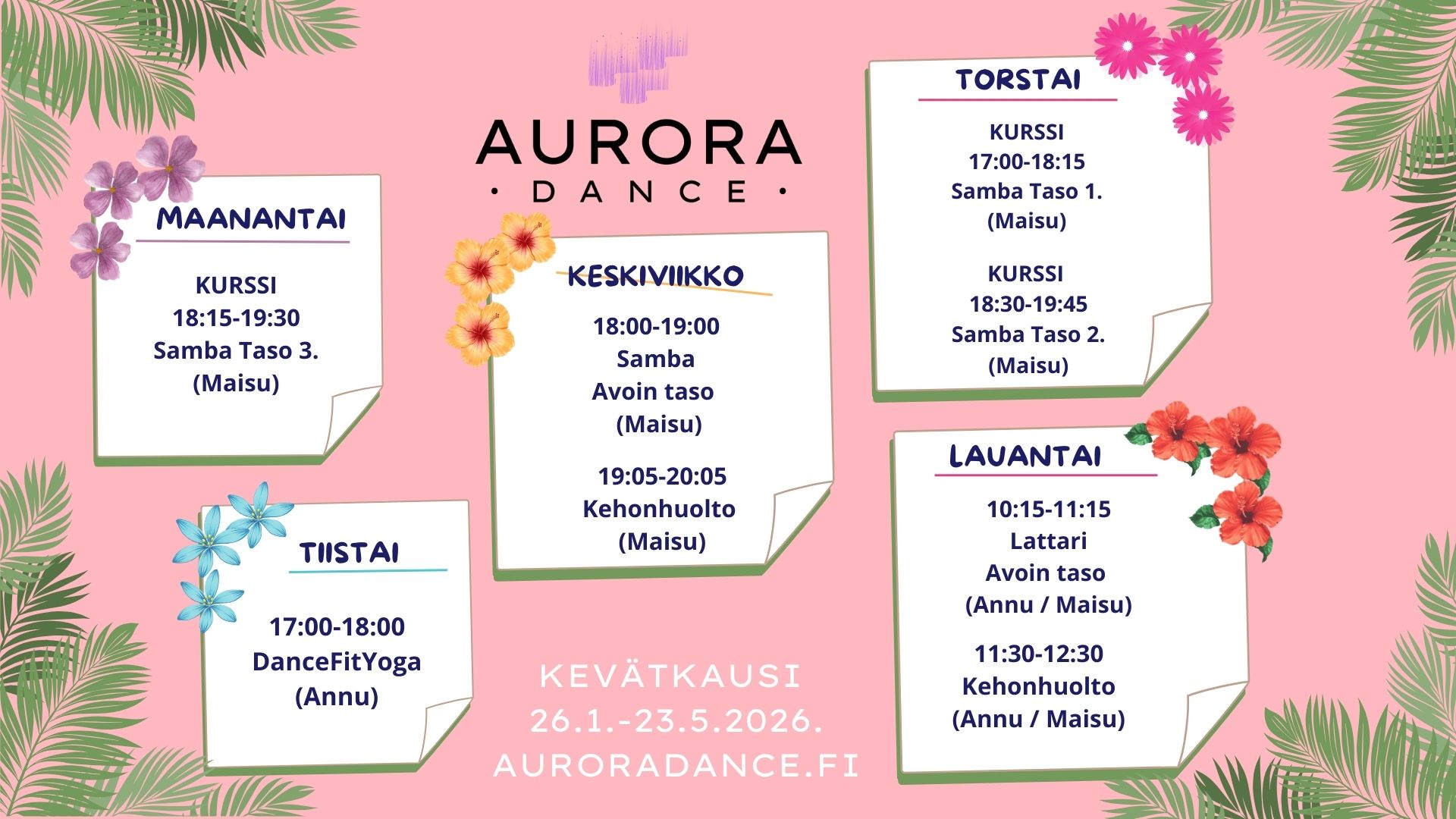 Paljon toivotut irtotunnit ovat nyt ensimmäistä kertaa lisätty Auroran kevätkauden viikkokalenteriin! Viikoittain toistuvat 60 minuutin irtotunnit tarjoavat joustavan ja rennon tavan harrastaa tanssia juuri silloin, kun se sinulle sopii. Voit osallistua yksittäiselle tunnille ilman sitoutumista kurssiin tai kauteen. Jokainen tunti on oma itsenäinen kokonaisuutensa ilman jatkumoa, eikä tämän vuoksi edellytä aiempaa osallistumista. Matalan kynnyksen irtotunnit sopivat erinomaisesti ensikertalaisille, satunnaisille kävijöille sekä kokeneemmille harrastajille, jotka haluavat nauttia tanssista vapaasti ja fiiliksen mukaan. Tule mukaan kokeilemaan, liikkumaan ja pitämään hauskaa – juuri omalla tavallasi.